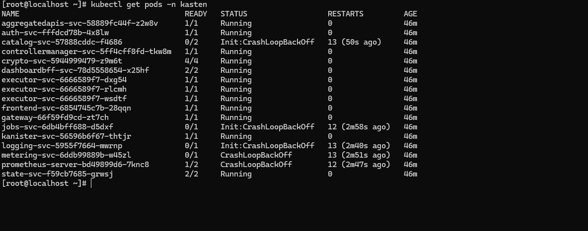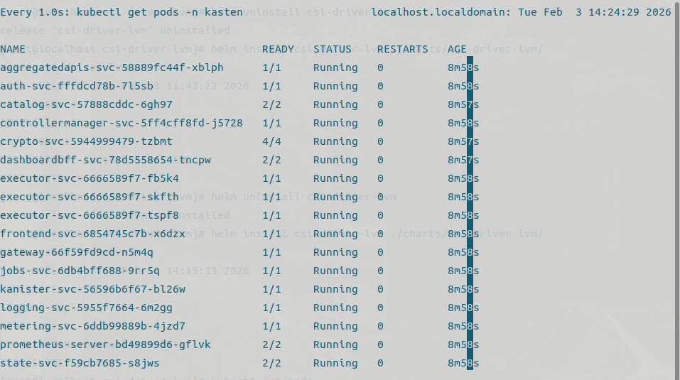 [testuser@localhost k10]$ kubectl get pods -n kasten